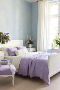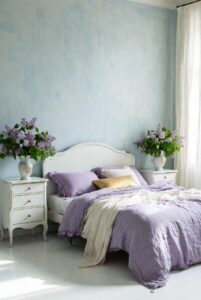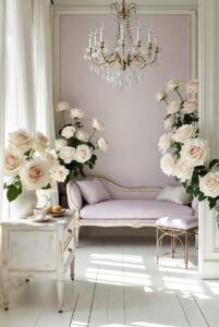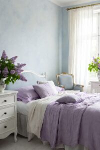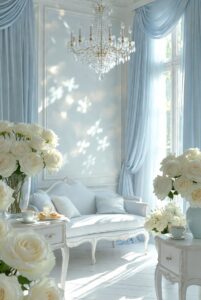 Her boudoir would glow in washed blue walls, paired with antique white furniture, soft lilac cushions and barely-there gold accents. These colours create a cocoon — gentle, airy and restorative — a space that invites daydreaming, journaling and slow mornings with porcelain cups and pastries.